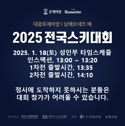 2025. 1. 18(토) 성인부 타임스케줄인스팩션, 13:00 ~ 13:201차전 출발시간, 13:352차전 출발시간, 14:10정시에 도착하지 못하시는 분들은대회 참가가 어려울 수 있습니다.대회 참가정시에 도착하지 못하시는 분들은가 어려울 수 있습니다.